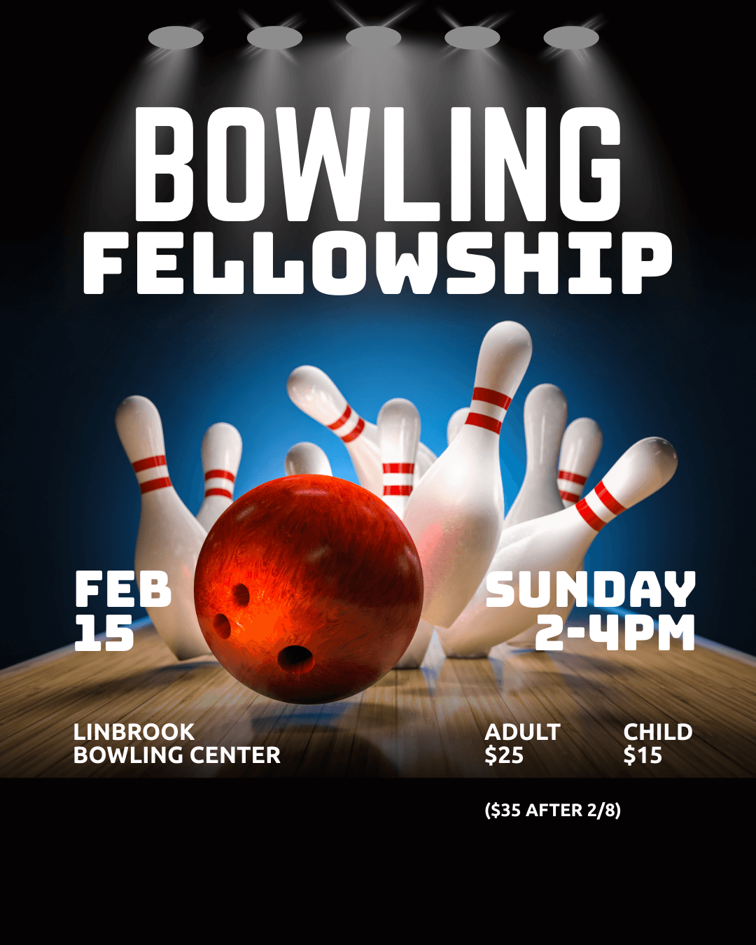 Join us for our church-wide bowling fellowship on Sunday, February 15, from 2-4PM! The cost is $25 for adults and $15 for kids (includes bowling and food) if paid by February 8. After February 8, the fee will be $35 per person. All fees are non-refundable.
